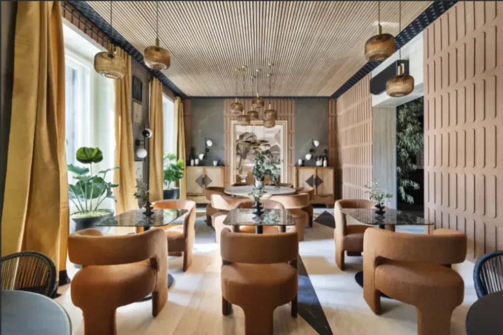 - Restaurante Maison du Monde (Raul Martins): el mismo está divido en 3 partes: 1ª Corte v Y vigas, 2º Fl en madera en el techo y en la pared píldoras y la 3ª sala Fl todo en PET. Este diseño no solo filtra ruidos ambientales, sino que crea una atmósfera cálida y sofisticada.